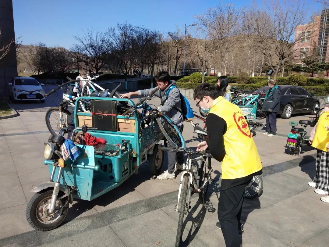 活动开展过程中,同学们将链条严重生锈或已经毁坏的落满尘土的自行车从自行车摆放处清理出并装车,同时将被风吹倒的自行车扶起;废弃自行车摆放处的同学们将运来的自行车进行整理并摆放整齐。