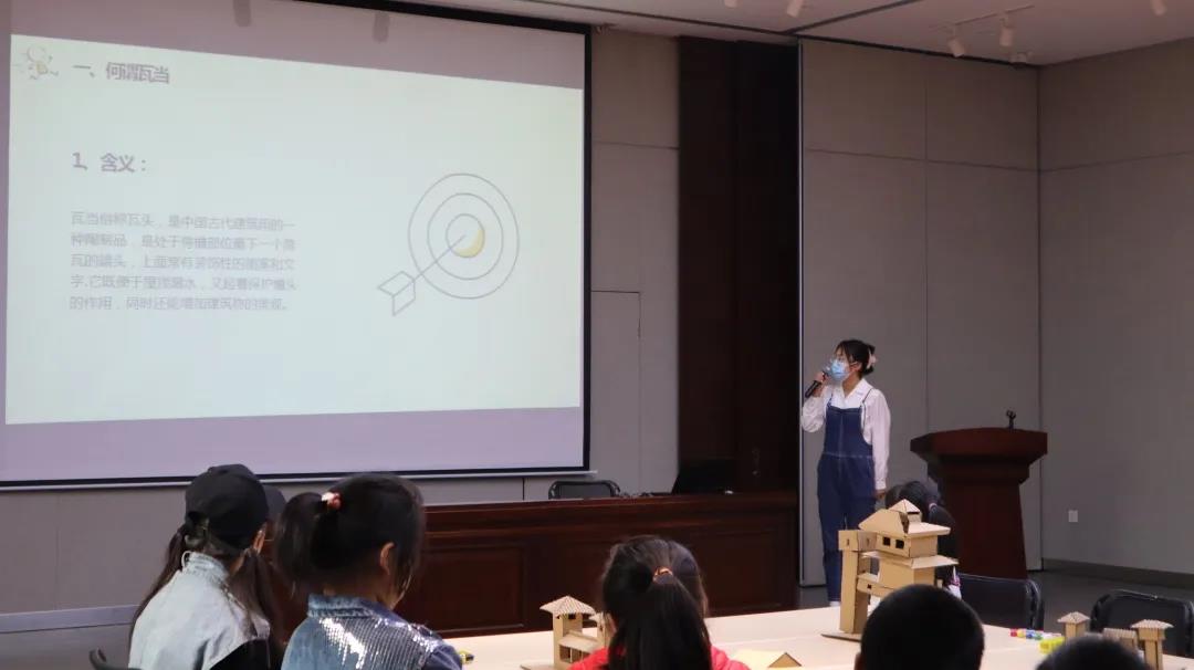 活动开始前,志愿者们提前到达市博物馆进行活动准备与机器调试。上午九时,参与本次活动的24名小学生到达,活动正式开始。首先,来自2018级建筑学系的李亚文等人借助视频、图片等形式向孩子们简单介绍了汉代建筑的形式与特点,并就汉代建筑特色瓦当进行了具体的介绍。孩子们在历史中认识建筑,学习新的知识,并与主讲人积极互动,现场氛围良好。