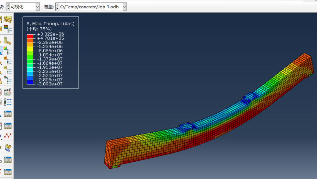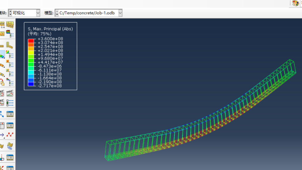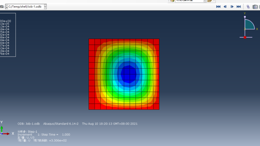 严文财以一块四边支撑、受竖向均布荷载的混凝土板为分析对象,讲解了使用ABAQUS进行壳单元分析的一般步骤,最终得到壳单元的应力云图和位移等值线图。