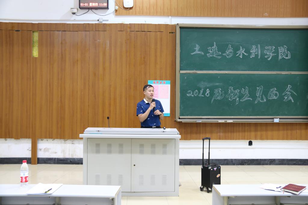 晚上7点,见面会正式开始,辛帅首先对2018级新生的到来表示热烈欢迎。之后,辛帅分别从课程学习、习惯养成、个人卫生、个人安全、军训纪律等方面对新生提出了建议和要求。发言中,辛帅多次强调了学习问题,鼓励新生努力学习,为自己的大学生活做好规划。此外,辛帅提到人身财产安全问题,并结合校园贷案例和近期热议的“滴滴事件”给出了建议,不盲目听信陌生电话,不轻信校园推销,帮助新生提高防范意识和自我保护能力。杨浩则首先提到“成年意识”,他强调,成年人要有快速适应新环境的能力,学会与人相处,处理好人际关系,无论是学习还是生活中,都要有责任意识。之后杨浩就新生较为关注的军训、英语测试、户口迁移等问题,说明了近期的工作安排,帮助新生提前做好准备。杨浩还现场播放了几个新生制作的视频,并让视频作者进行了自我介绍,大大拉近了新生的距离。和新生谈到学习时,杨浩提出,专业课的学习是重中之重,大学更加考验自主性和自制力,因此要从自身重视课程学习。在生活中,情感经历也是一种学习途径,每个人都要在不断的成长中学会交往,学会呵护。杨浩还强调了重视运动与健康,建议新生在大学生活中养成良好作息,加强体育锻炼,保持身心健康,让大学生活充满活力。