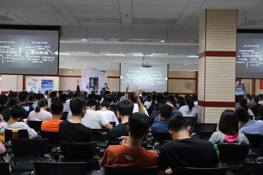 陆术东主要从地产行业的发展趋势和大学生发展规划两方面进行了分享。他从近十年来楼市的起伏变动谈起,通过对房地产四“变”和四“不变”要素的分析,清晰地展示了如何在变化中以合适的视角解读房地产行业的发展。陆术东表示,四“不变”现象表明房地产行业在未来15-20年内的发展前景依旧广阔,并且人才需求量巨大;而四“变”现象则提示大家,无论是个人发展还是公司投资都应遵循变化规律,以确保低迷时期的平稳发展和上升时期的快速前进,他借此教导同学们应善于总结规律,合理规划未来发展方向,选择发展的最优解。结合自身经历,陆术东就大学生应当如何规划发展方向给出了建议。他强调了自我认知对于个人发展的重要性,指出同学们要把握社会要求,分清职业特质,明确奋斗目标和企业型人才的要求,不断完善自我,在差距中寻求动力、发挥潜力。在交流环节,同学们踊跃进行提问,陆术东针对企业人才吸收、学生能力培养等问题做了详尽周密的解答,本期讲坛圆满结束。