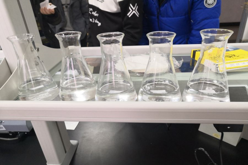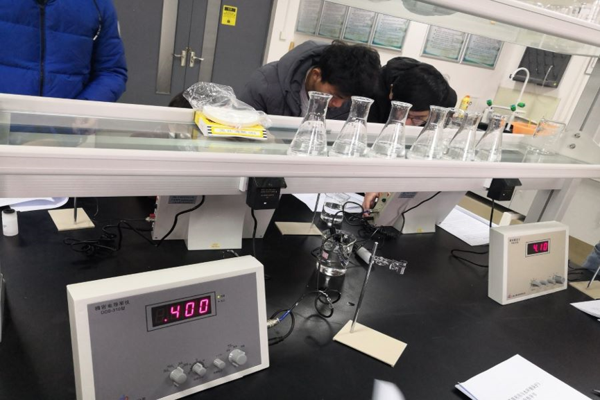 随后团队为了了解各水源絮凝后温度、ph值、电导率的特点,再次来到实验室,在老师的帮助下,进行了絮凝试验并于当天下午一点左右结束。通过这两天的试验,团队基本了解了泉城各水源的基本特征与特征值的检验方法。实验结束后,对实验结果作出了点评和建议,如水质温度应当场测量,带回来的水温略有变化等。