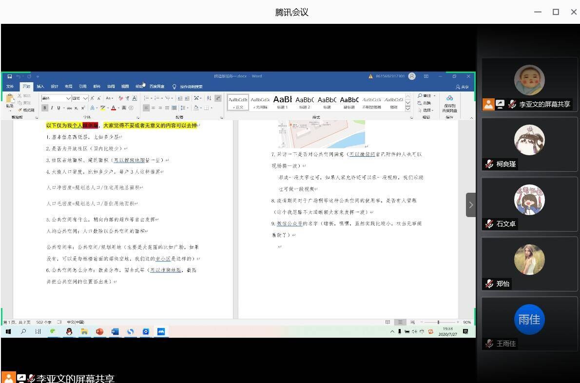 关于社区公共空间生活质量分析调研团于线上召开启动会议。本次会议由队长李亚文主持,全体团队成员参加。