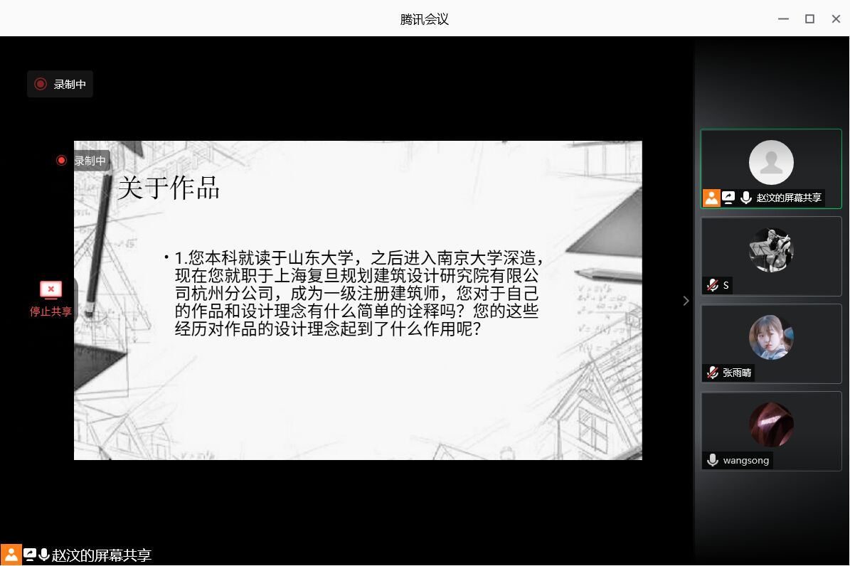 “再话芸窗”社会实践团队通过腾讯会议对建筑学系校友王嵩进行个人专访。此次会议由赵汶主持,实践团队三名队员参加。