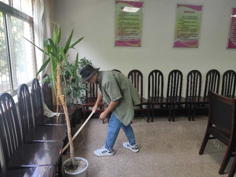 参观完毕,刘亚轩与李熠进行清洁工作,完成服务中心每日的清洁任务,并对近期脱贫攻坚相关活动报表进行整理,体验中心脱贫攻坚相关工作。