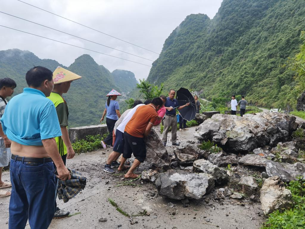8月4号上午, 由于暴雨的影响导致村中主干道发生岩体滑坡,下滑岩体堵住了道路导致车辆无法往来,严重影响了村内出行交通。实践团队跟随村书记裴文豪,驻村工作人员韦德欢,村务协理梁月姣第一时间抵达了现场开展了道路紧急修复工作。在观察确定四周环境安全后,团队成员与前来帮助的公益性岗位人员以及村民协力将堵在道路的岩石搬移清除,紧急开辟出了可供车辆通过的道路,恢复了村内的交通通行。安兰村驻村工作人员一直奔赴在一线,将人民利益放在第一位,密切联系群众,工作作风扎实,团队成员被他们的精神深深地感动着,向他们学习!