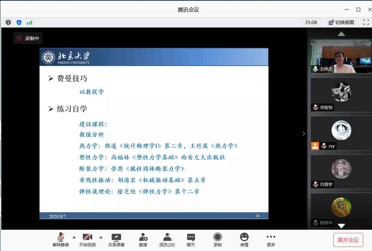 最后,刘俊杰和刘明超两位校友一起和各位与会成员进行线上讨论交流。刘明超是我校2009级工程力学专业的学生,2018年于清华大学获得力学专业博士学位。被问及目前的情况,他说他现在在牛津大学数学研究所工作,主要研究弹性稳定性及其在机械超材料中的应用。刘明超强调说,许多科目,最基本的定义定理是最重要的,特别是对于数学研究,刷题不能在本质上提高数学能力,要对基本的知识有深刻的理解。最后赵盛源感谢此次的报告会分享。至此,会议正式结束。