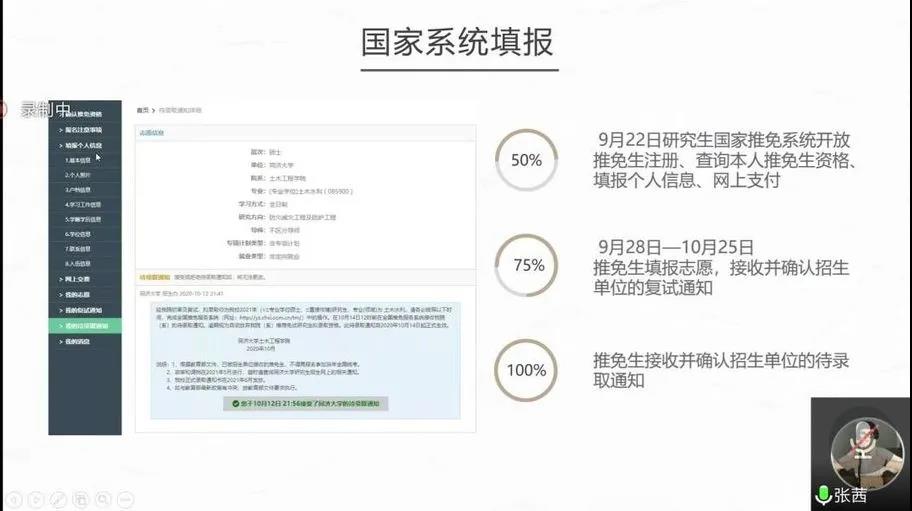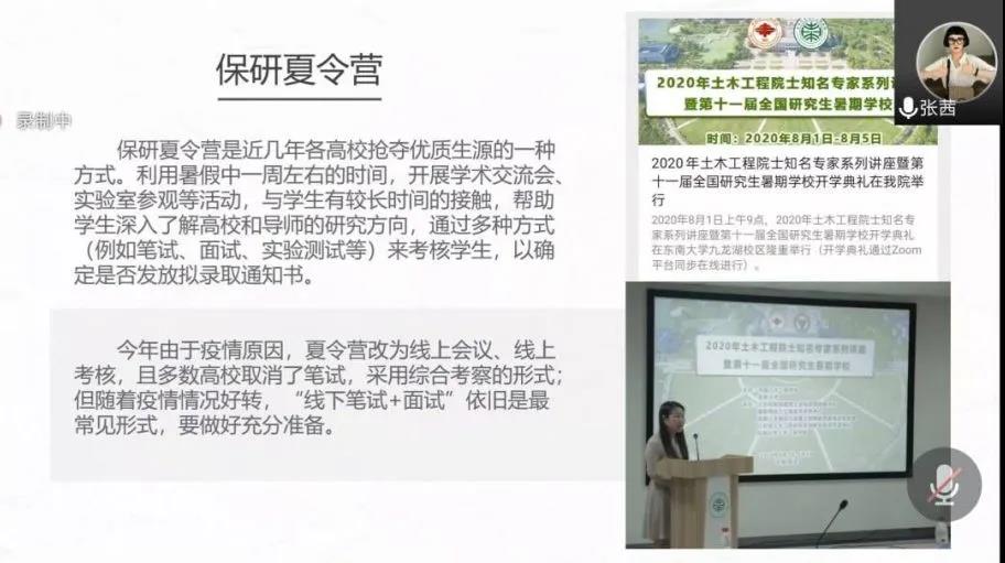本次保研经验分享会由保研流程综述、详细介绍本校保研和各项单列保研、如何选择、如何准备四个方面展开。首先,郑星阳介绍了近几年土木工程系的保研率,建议同学们对自身条件进行评估,考虑自己保研成功的可能性。接着,他对“夏令营”、“预推免”和“九推”进行了简单介绍。张茜表示,学分绩点和比赛活动是取得保研资格的主要方式,同时强调了四六级的重要性。她向同学介绍了保研夏令营的参加流程,建议有意向的同学做好参加线下笔试和面试的充分准备。王晓阳从成绩排名推优和单列计划推优两方面进行讲解。他说明了做爱视频